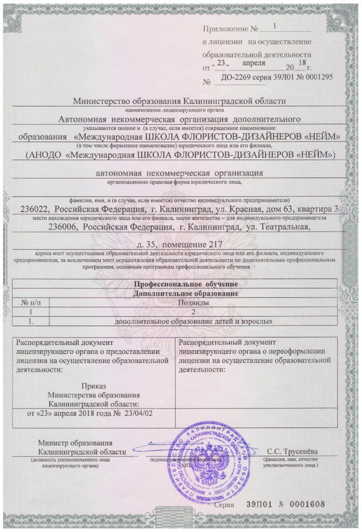 Образовательное учреждение АНОДО «Международная ШКОЛА ФЛОРИСТОВ-ДИЗАЙНЕРОВ "НЕЙМ"» имеет лицензию на следующие виды образовательной деятельности: дополнительное образование детей и взрослых.